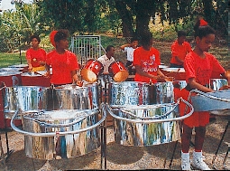 Traditionnellement, le steel drum <<tambour d'acier ou pan>> des Antilles est fait, à partir d'un fût de pétrole vide. Au lieu d'une peau tendue, on utilise une cuvette métallique sur laquelle ont été délimité plusieurs panneaux qui, lorsqu'on les frappe avec des baguettes dont le bout est en caoutchouc donnent chacun une note différente. Il y a de trois à cinq notes par fût. Un orchestre comprend plusieurs "bidons" différents et les musiciens sont répartis par tonalités. Il y a en tout sept tonalités.