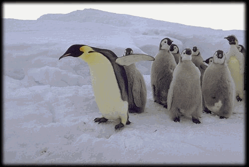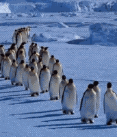 Juin : C’est l’hiver, un froid infernal ; la nuit est continuelle. Cette saison est dangereuse ; la température est de -30° C. Le blizzard souffle à 200 km/h, ce qui équivaut par -30°C à une température de -180°C. Les manchots évitent le froid en se regroupant "en tortue". Les mâles ont une grosse couche de graisse qui recouvre l’œuf et le protège du froid. Leur plumage emprisonne de l’air ce qui les isole aussi du froid.