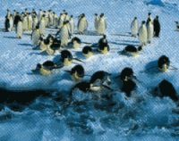 Mars et avril : C’est la fin de l’été (0°C). Les manchots empereurs viennent se reproduire en colonie en Antarctique. Un mâle mesure 1m20 et pèse 45 kg. La femelle est plus petite que le mâle.