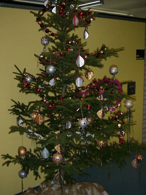 Les boules ont été sprayées en argent, puis les enfants ont planté des punaises de toutes les couleurs. Il y a d'autres boules en papier brillant et des guirlandes.