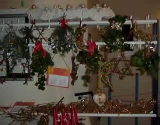 Nous avons fait des anges en papier d'alu doré et argenté, des arrangements de Noël avec du bois, des branches de sapin et de petites décorations.