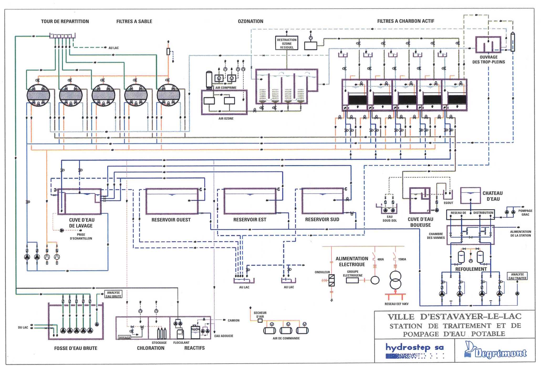 L'eau arrive au sommet de la station, puis elle descend dans les différents lieux où elle est traitée:
