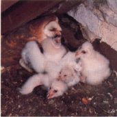 Elle niche dans les greniers ou dans des troncs morts. Son nid est fait de branches, de plumes et de feuilles.