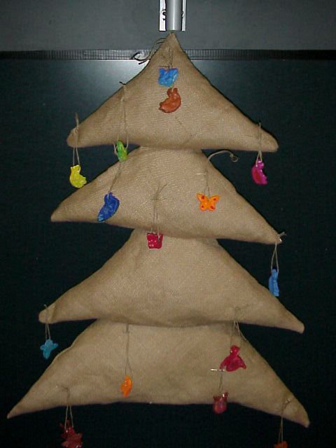 Les enfants ont peint de petits animaux en pâte à sel qu'ils ont ensuite accrochés au sapin fait avec de la jute.